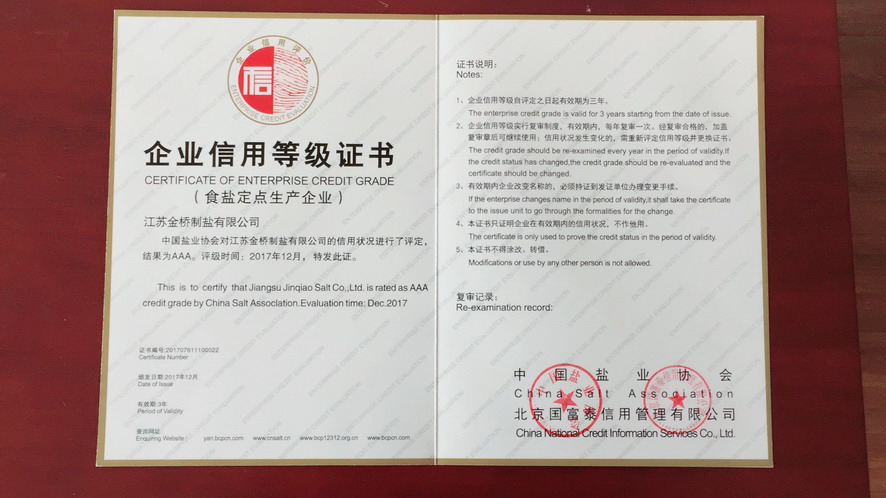 按照主營(yíng)業(yè)務(wù)收入、利潤(rùn)、主營(yíng)業(yè)務(wù)收入利稅率及主營(yíng)業(yè)務(wù)增速四項(xiàng)指標(biāo)評(píng)價(jià),2016年集團(tuán)公司被中國(guó)輕工業(yè)聯(lián)合會(huì)和中國(guó)鹽業(yè)協(xié)會(huì)評(píng)為中國(guó)輕工業(yè)制鹽行業(yè)十強(qiáng)企業(yè)。根據(jù)《社會(huì)信用體系建設(shè)規(guī)劃綱要(2014—2020)》,經(jīng)第三方專業(yè)評(píng)價(jià)機(jī)構(gòu)和中國(guó)鹽業(yè)企業(yè)信用等級(jí)評(píng)價(jià)委員會(huì)審核并向社會(huì)公示,2016年江蘇金橋制鹽有限公司被評(píng)為AAA級(jí)食鹽生產(chǎn)企業(yè)。