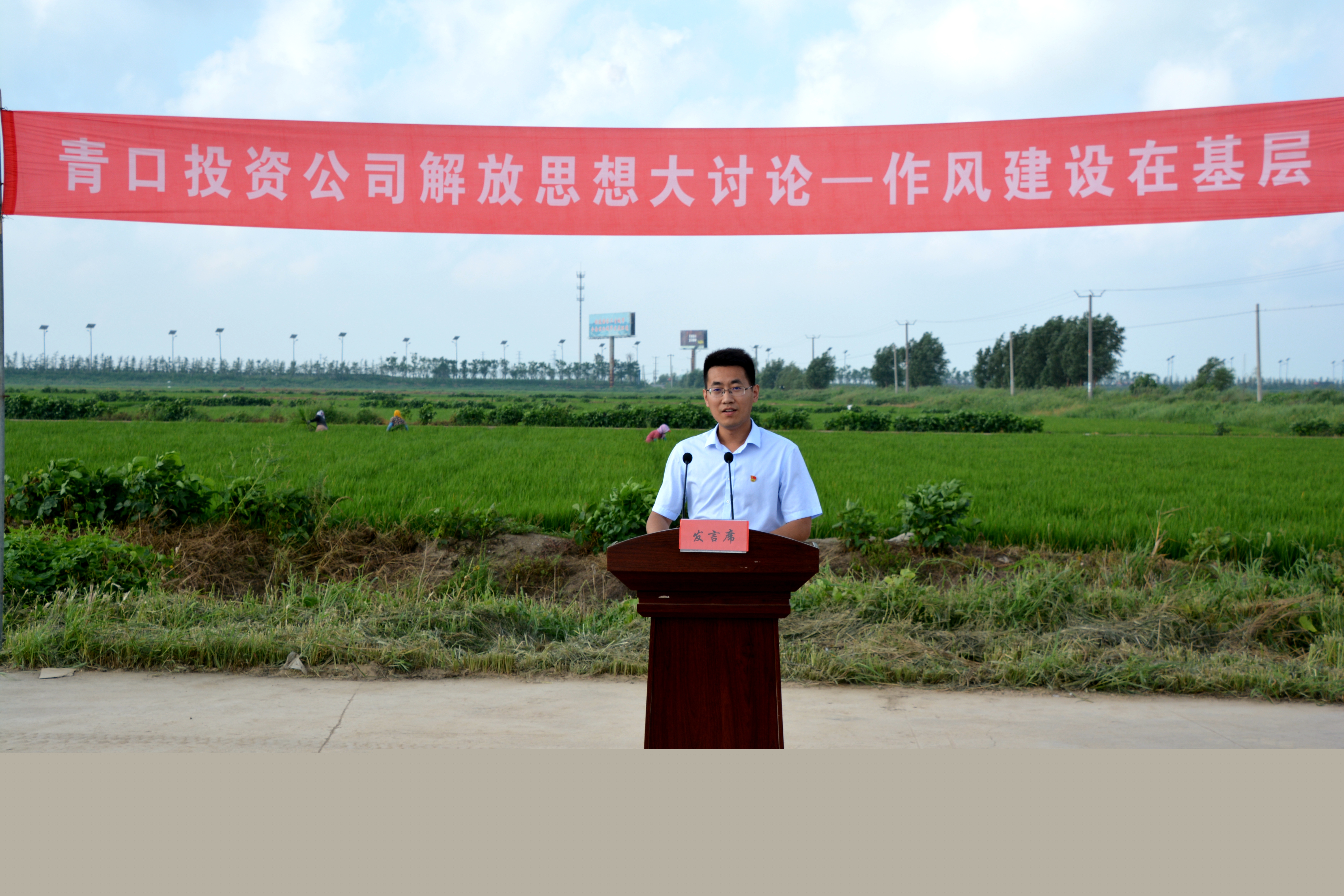 八月盛夏,高溫持續(xù)。清晨五點(diǎn)多,旭日剛剛升起,青口投資公司萬畝“鹽稻”在陽光照耀下美如畫卷,該公司大新農(nóng)場(chǎng)田頭已經(jīng)沸騰起來了。只見橫幅早已高高掛起,人員也悉數(shù)進(jìn)場(chǎng),不時(shí)傳來調(diào)試音響的聲音,一場(chǎng)接地氣的“作風(fēng)建設(shè)在基層”論壇就在這里拉開帷幕,八十余名干部職工在藍(lán)天白云下感受了這場(chǎng)別開生面的“田頭論壇”。