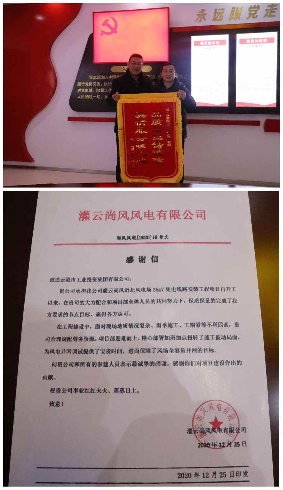 1月28日上午,灌云尚風(fēng)風(fēng)電有限公司副總經(jīng)理王現(xiàn)奇一行來到公司,授予我司一面錦旗和一封《感謝信》,以感謝半年來我司在灌云尚風(fēng)沂北風(fēng)電場35kV集電線路安裝工程項目中做出的貢獻。