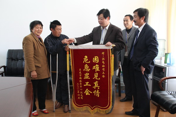 4月28日,巨龍農(nóng)貿(mào)市場特困職工劉元國拄著雙拐,在妻子陪伴下來公司送上錦旗,感謝干部職工的愛心捐助。去年初,下崗后在外謀生的劉元國因討要欠款發(fā)生車禍,腰部、腿部嚴(yán)重骨折,花費(fèi)10萬余元,全家借錢度日。為讓劉家生活得到改善,春節(jié)前全公司發(fā)起獻(xiàn)愛心活動,共為劉元國募集錢款萬余元。(司宣)