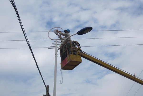 圖為工人們在搶修路燈 日前,青口供電所為青口鹽場烘托中秋、國慶“兩節(jié)”氣氛,美化、亮化街道環(huán)境,在人力緊張的情況下,抽出6名職工,利用兩天時間,義務(wù)搶修路燈70余盞。(宋中文)