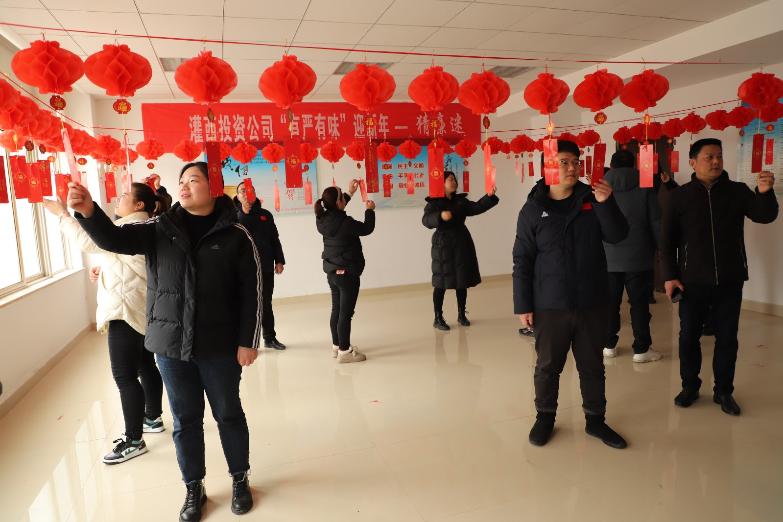 “樹我中華廉政風(fēng)——打我國(guó)兩節(jié)氣?!薄胺锤Wゲ恍浮蛞恢袊?guó)地名?!?月27日,灌西投資公司辦公大樓廉政文化展廳內(nèi)紅紅的燈籠格外喜慶,近百條廉政燈謎依次懸掛,一場(chǎng)集知識(shí)性和趣味性于一體的廉政燈謎有獎(jiǎng)競(jìng)猜活動(dòng)吸引了百余名員工聚集參與,大家一起開動(dòng)腦筋,爭(zhēng)相“解密”。