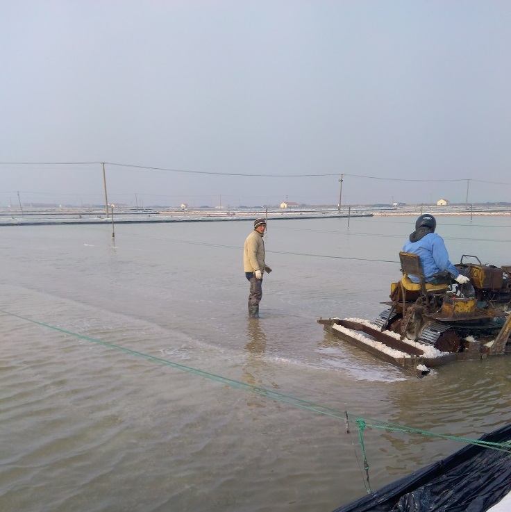 埒南制鹽分公司抓緊做好池鹽破碴工作,為即將開始的春季扒鹽作好準備,利用5臺唐30對去年下半年未參加扒鹽的格塊進行機械破碴,目前已經(jīng)破碴70%以上。圖為職工利用唐30在池內(nèi)破碴。(埒宣)