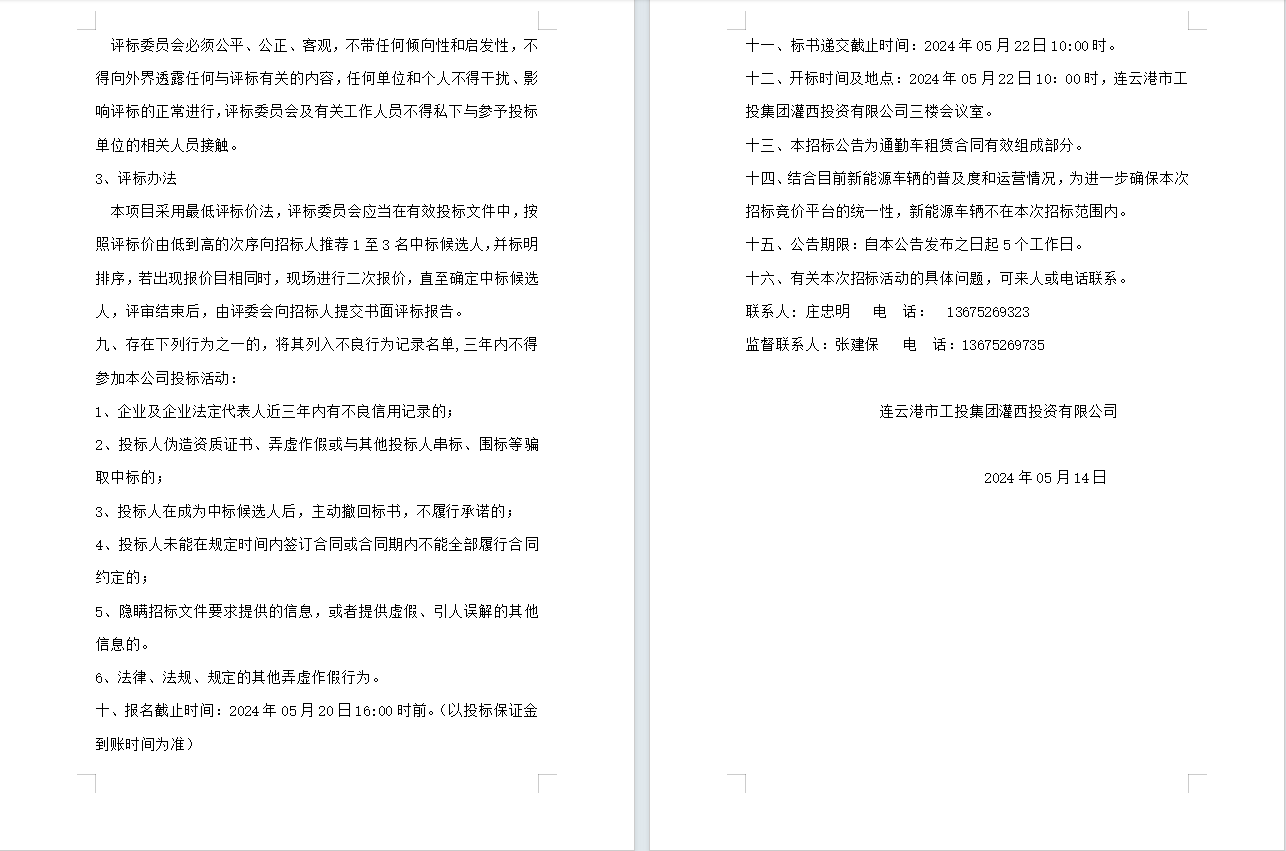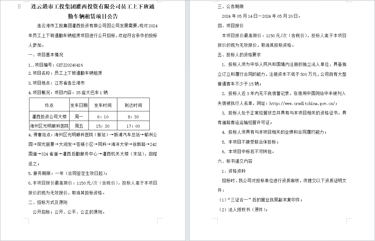 連云港市工投集團(tuán)灌西投資有限公司員工上下班通勤車(chē)輛租賃項(xiàng)目公告