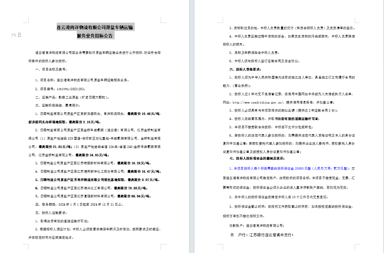 連云港宵洋物流有限公司原鹽車輛運輸服務(wù)業(yè)務(wù)招標公告