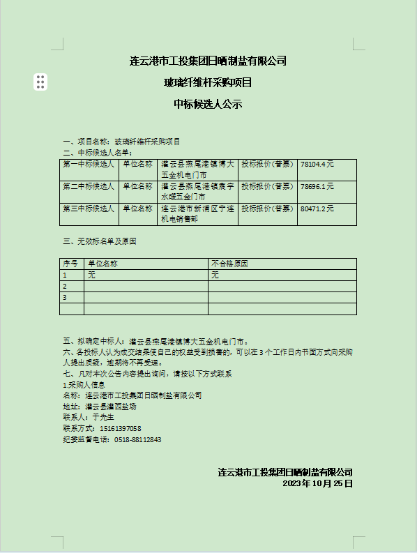 連云港市工投集團(tuán)日曬制鹽有限公司玻璃纖維桿采購(gòu)項(xiàng)目中標(biāo)候選人公示
