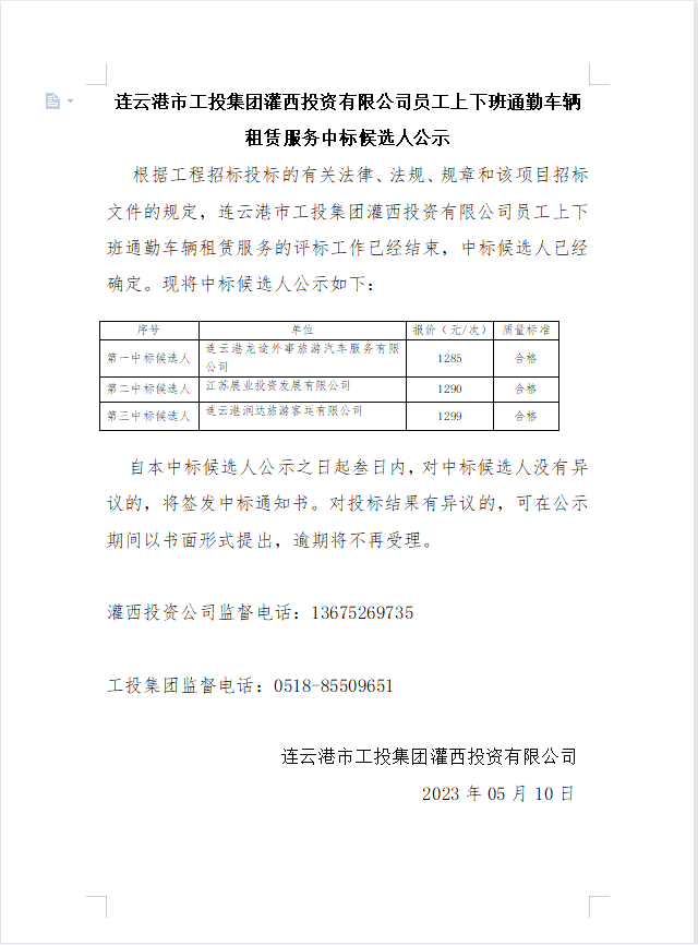 連云港市工投集團(tuán)灌西投資有限公司員工上下班通勤車輛租賃服務(wù)中標(biāo)候選人公示