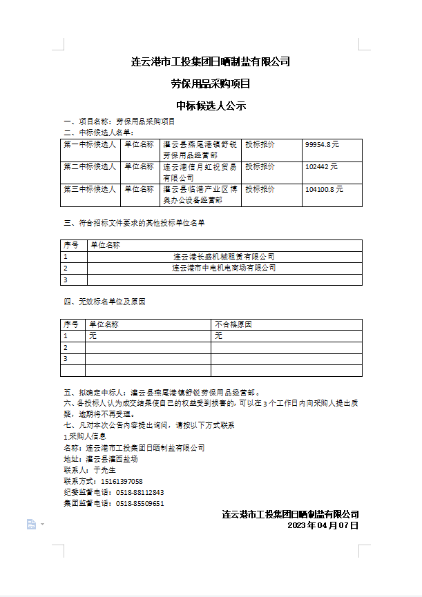 連云港市工投集團(tuán)日曬制鹽有限公司勞保用品采購(gòu)項(xiàng)目