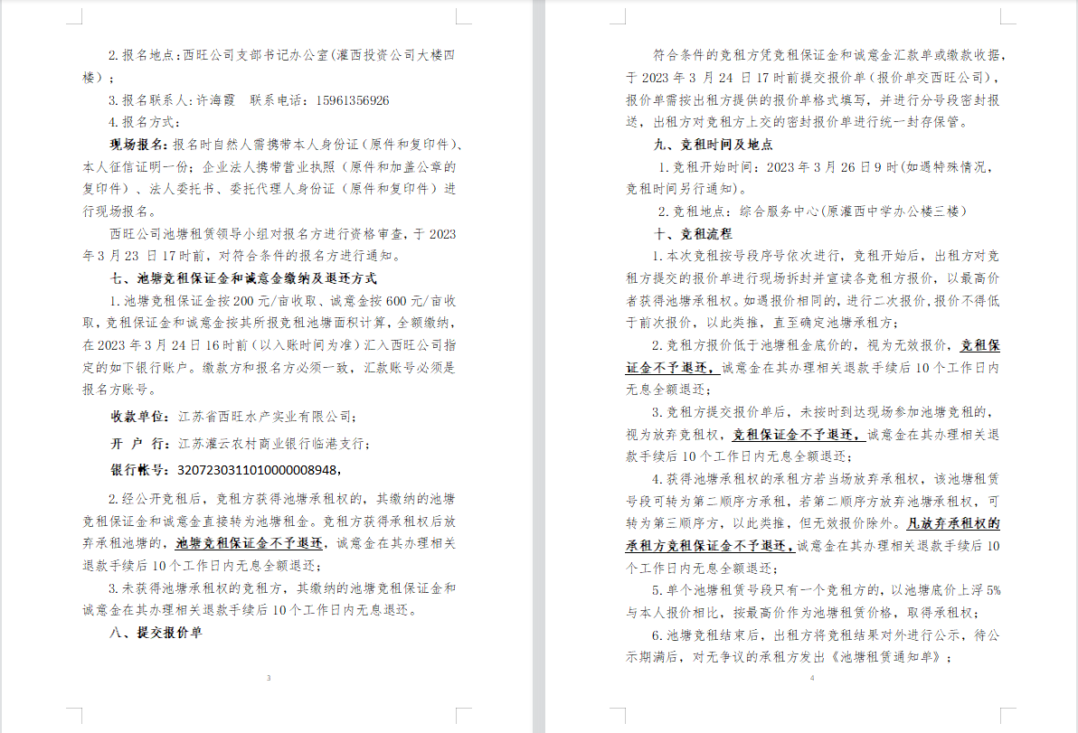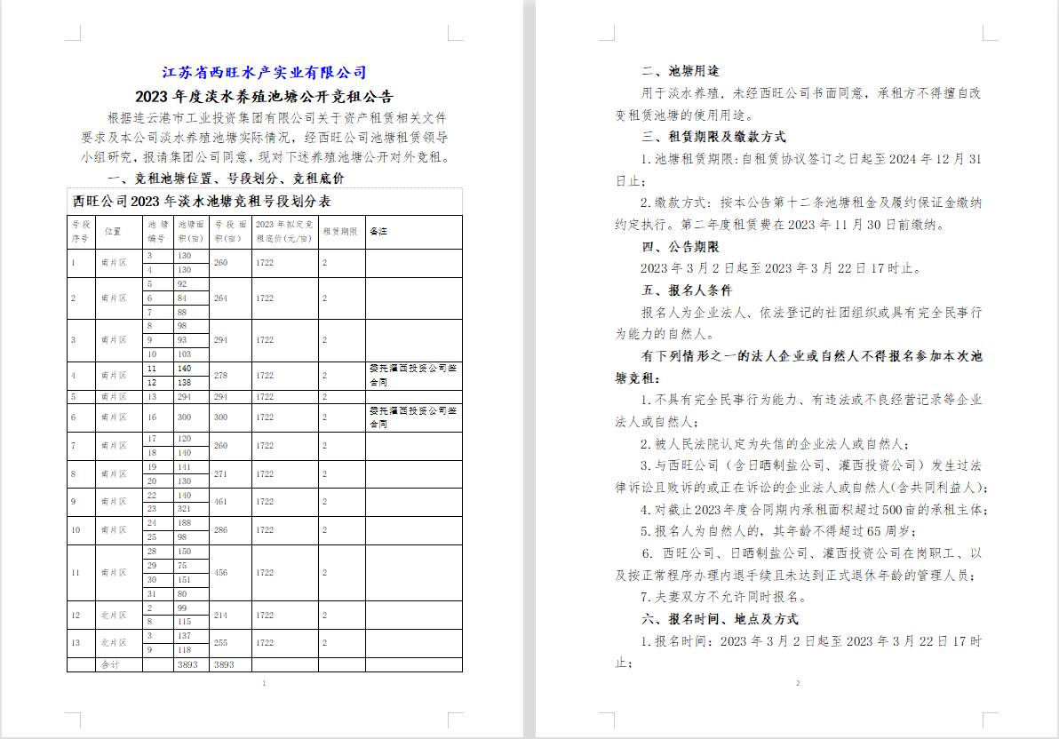 江蘇省西旺水產(chǎn)實(shí)業(yè)有限公司2023年度淡水養(yǎng)殖池塘公開(kāi)競(jìng)租公告