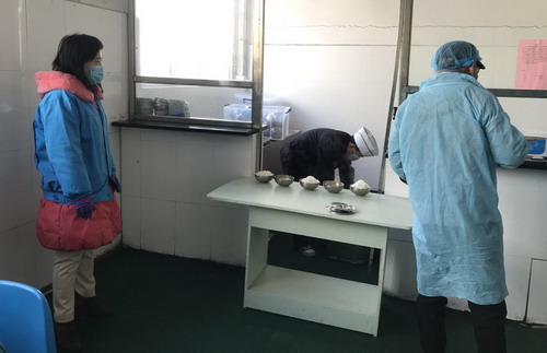 齊欣梅檢查職工食堂午間就餐情況(左一)