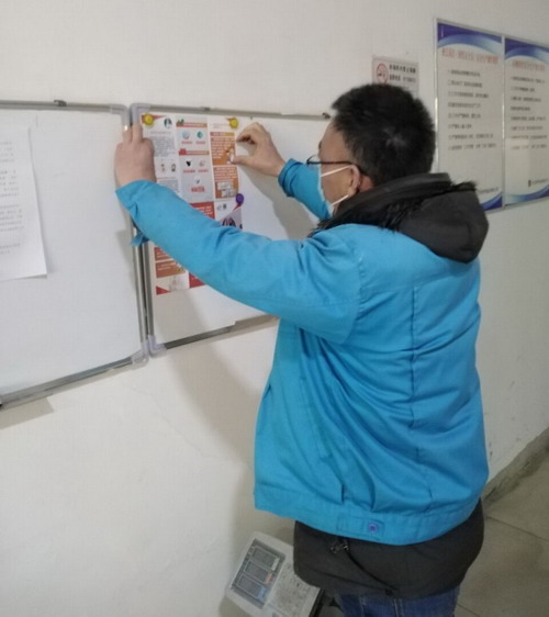 陳東在加工鹽車間宣傳欄張貼防疫宣傳資料