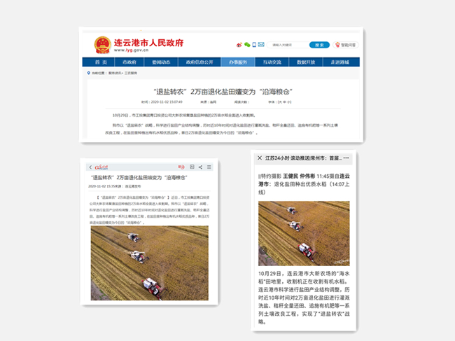 今年收割期間,人民網(wǎng)、光明網(wǎng)、江蘇24小時、連云港市人民政府網(wǎng)、連云港日報連續(xù)報道了我公司鹽堿地水稻豐收、秸稈綜合利用等工作舉措。我公司在現(xiàn)代農(nóng)業(yè)發(fā)展和生態(tài)文明建設(shè)中取得的成就受到了媒體廣泛關(guān)注。(青宣)