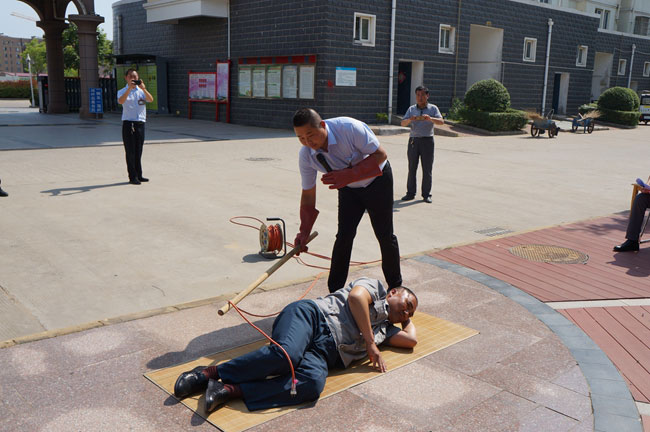 ? ? ? ? ?本次演練模擬一名物業(yè)維修人員施工不慎碰到裸露的電線,導(dǎo)致觸電倒地。在演練現(xiàn)場,專業(yè)電工、醫(yī)護人員先向觀摩人員詳細講解了觸電急救、人工呼吸及胸外心臟擠壓等救援理論知識,并進行施救演示。經(jīng)過 20多分鐘的演練,順利完成了演練任務(wù)。演練結(jié)束后,安全技術(shù)部負責人對演練情況進行綜合點評,并對泰祥員工安全知識進行培訓(xùn),泰祥公司現(xiàn)場發(fā)放了安全用電小常識等宣傳材料。通過此次演練使員工對觸電事故的應(yīng)急救援步驟和方法有了更深的認識,進一步提高職工觸電急救的能力,有效地提高了職工防范安全風險的意識。