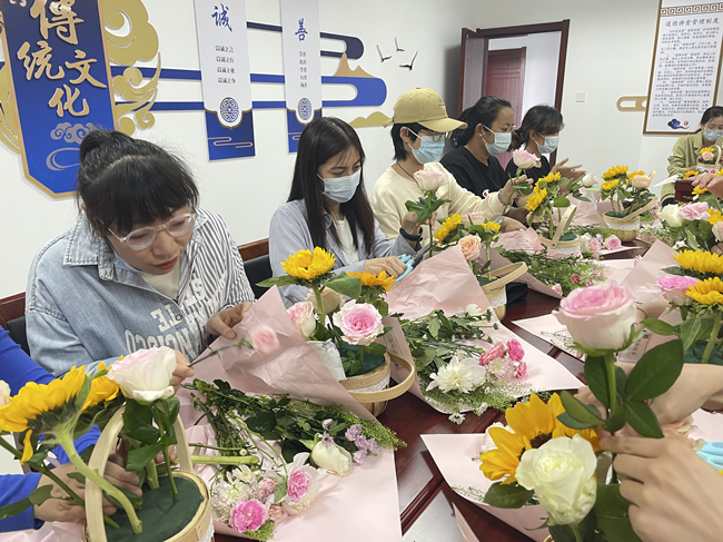接下來,女工委組織了插花活動,特邀插花老師現(xiàn)場講授插花知識及技法,借用花木來抒發(fā)女職工以花感人,以花育人,意在培養(yǎng)女職工善于表達(dá)對母親的愛及祝福。在花藝師的悉心指導(dǎo)下,女職工們用自己靈巧的雙手,盡情發(fā)揮創(chuàng)造力,為母親制作一個美麗、飽含感恩之情的花籃。