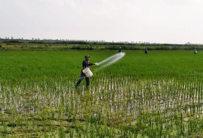 (對(duì)秧苗進(jìn)行撒施分蘗肥)
