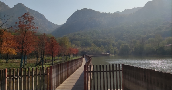 斗轉(zhuǎn)星移,山河已變,五百年前詩人所描述的風(fēng)景我們無法再欣賞到,但是現(xiàn)在的園林水庫更有一番風(fēng)采。火紅的水杉是她最引人注目的特色之一,寒風(fēng)掠過,水杉的葉子也逐漸變成了鮮艷的火紅色,猶如一片片燃燒的火焰,在寒冷的季節(jié)中增添了一抹暖色。徜徉于火紅的水杉林,陽光下樹影婆娑,寧靜,安逸,沉醉于詩畫中。波光粼粼的湖水更是一幅美妙的畫卷,清澈透明,水草搖曳,微波蕩漾,游魚穿梭,仿佛寒冷與它們無關(guān)。棧橋嫻熟地穿越著園林與水庫,一直連接到山腳,行走其上,腳下水光瀲滟,眼前層林盡染,晴空之下無一絲塵埃,啾啾鳥鳴,沙沙葉響,嘩嘩水流,大自然的樂章歡快靜謐。