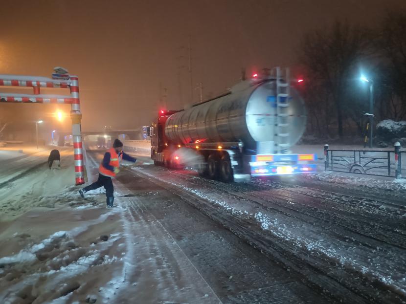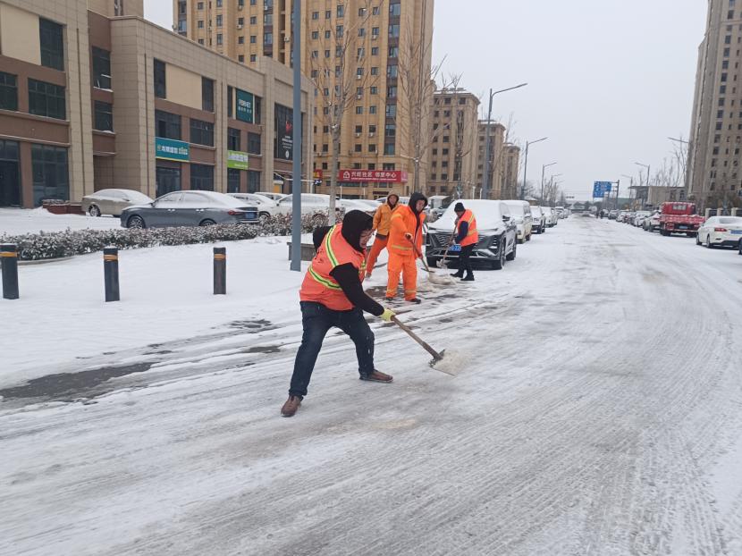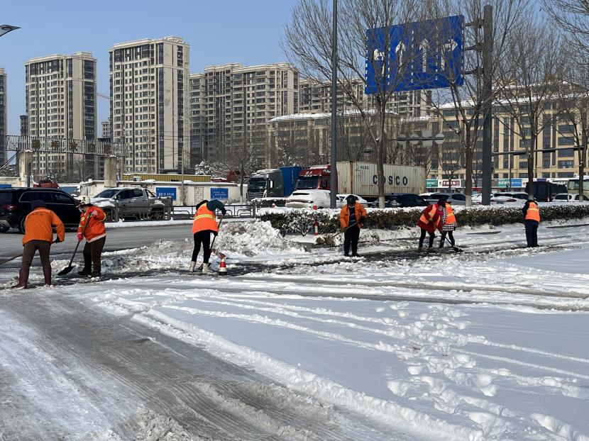 5日凌晨4點(diǎn),該公司負(fù)責(zé)人于廣華已經(jīng)在除雪的第一線,積極安排工作調(diào)度,對新光路、平山路、黃海大道等重要路段突擊清掃,大家頂著風(fēng)雪,齊心協(xié)力,分工明確,高效配合,全力清除路面上的積雪和暗冰,及時為車輛和行人清理出一條條“安全路”。