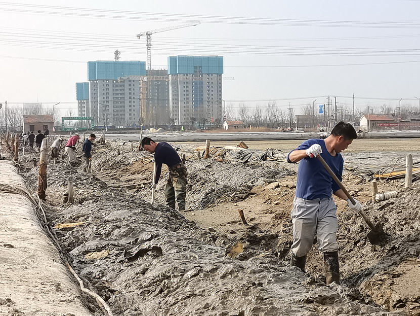 礦鹽復(fù)產(chǎn)項(xiàng)目部,聘請(qǐng)日曬制鹽專家王緒前進(jìn)行工藝指導(dǎo),聘請(qǐng)勞模朱春年帶領(lǐng)團(tuán)隊(duì)攻堅(jiān)。復(fù)產(chǎn)戰(zhàn)役從2021年12月就打響了,春節(jié)的時(shí)候,他們僅休了三天假,大年初三全部到崗,一鍬一鍬挖泥通溝,一條一條池堰加高整平,一塊一塊鹽田清理壓實(shí)......到2月,他們硬是把征地后廢棄許久的鹽田和邊角地整理成礦鹽基地,結(jié)晶池面積達(dá)1950公畝,達(dá)產(chǎn)可產(chǎn)原鹽20000噸。