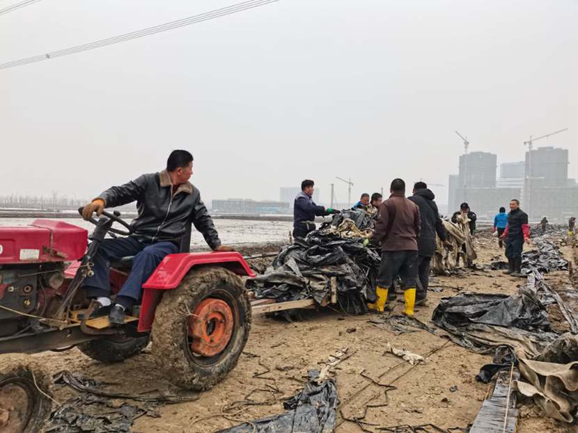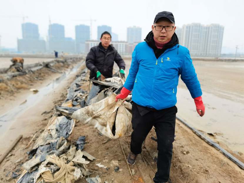 110日下午,第一批馳援隊伍——翔立分公司黨員突擊隊到達先鋒班組,結(jié)合海州灣公司黨員突擊隊共30余名隊員,穿戴好工作服、水鞋,兩人一組,三人一隊,雙肩挑,三人抬,緊張有序地清理生產(chǎn)現(xiàn)場拆除下來的廢棄的塑布、鋼絲等雜物。