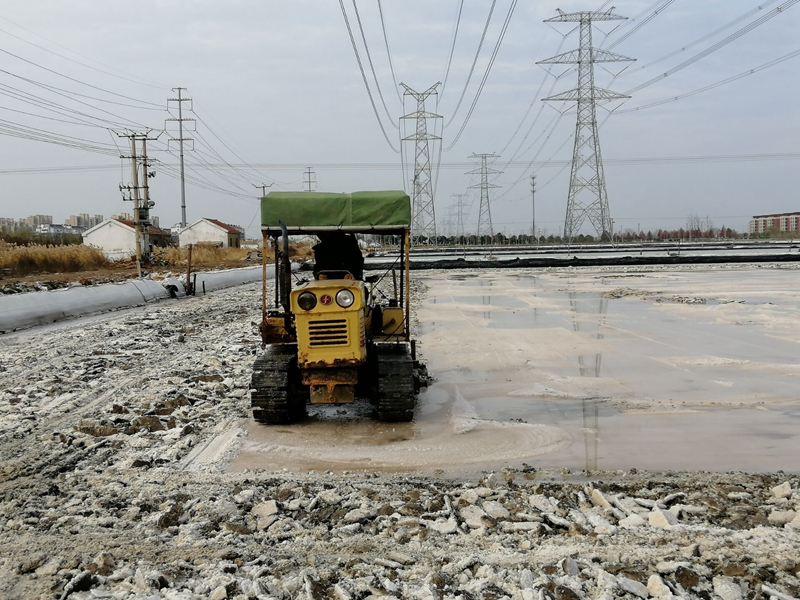 由于勞動力較為缺乏,人工扒鹽分為兩個班次白班和小夜班。工人們在完成各自班次任務的同時,還要承擔起后期繁瑣的相關工作。例如:扒鹽前要將塑池內(nèi)的塑布整理、收縮到位、用活碴機對準備要扒格塊進行活碴、成廩后對鹽廩全面覆蓋、并抽出專人對大夜班空檔期電纜線及機電設備進行看管等等。其中池板整理是一項緊急活,扒完鹽后鹵水要緊跟著進池,小夜班的人下班后有時只睡幾個小時,早上7點多就來到灘頭整理池板,為抓緊灌池爭分奪秒爭。