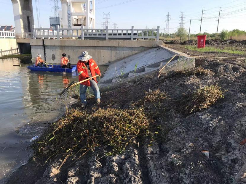 作業(yè)過程中,打撈人員因地制宜,采取分段清理、圍攔堵截、水上打撈等方式進(jìn)行打撈,有的坐在船上用濾網(wǎng)、鉤耙等工具清理河面雜草,有的在岸邊將水草打撈上岸,并其進(jìn)行集中處置,防止對(duì)河道造成二次污染。通過3個(gè)多小時(shí)的清理打撈,河道中的水流恢復(fù)暢通。