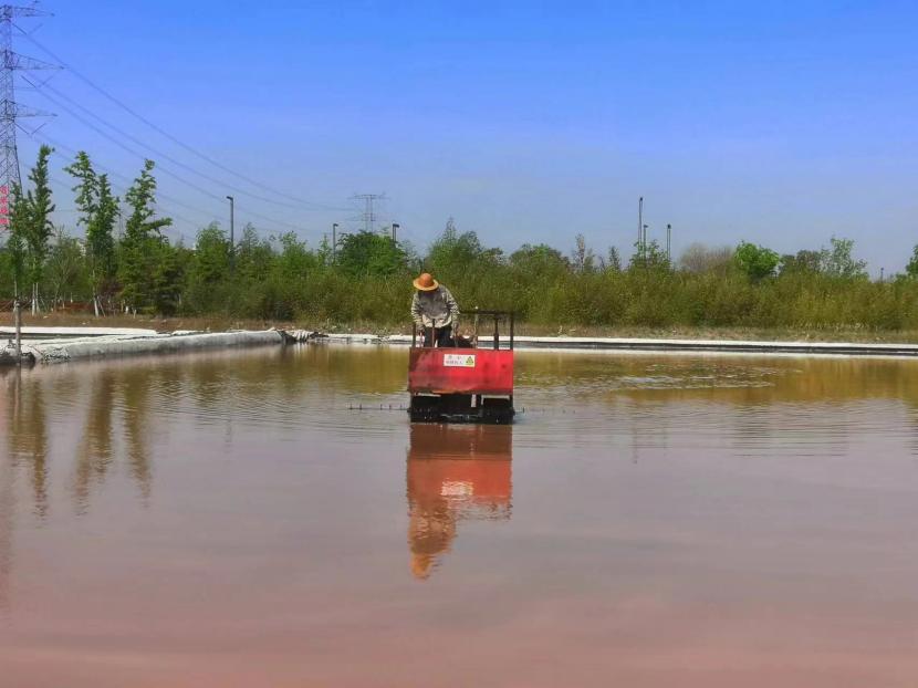 在原鹽生產(chǎn)中有一道重要的工序叫“活碴”,就是把結晶池中的鹽進行翻動,翻動后有利于鹽晶面生長,增加鹵水與鹽晶體的接觸面積,提高原鹽產(chǎn)量。每日清晨6點半,礦鹽班組準時有一名工人駕駛活碴機,對鹽池板進行破碎翻動,保持鹽層的疏松和顆粒間一定的間隙,確保晶體長得既快又好。