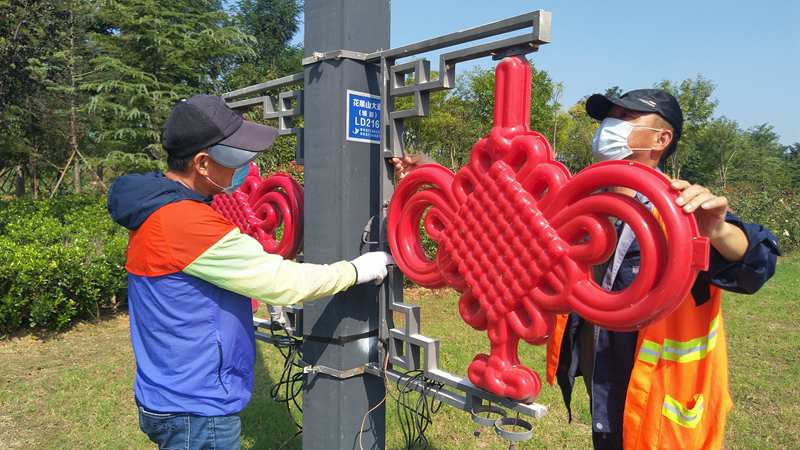 和往年一樣,今年“中秋”“國(guó)慶”兩節(jié)前夕,資源管理分公司組織公司精兵強(qiáng)將加入到翔立分公司兩節(jié)前道路亮化景觀突擊行動(dòng)中,該公司這些志愿者隊(duì)員有的維修破損的中國(guó)結(jié)紅燈籠等亮化燈,有些負(fù)責(zé)安裝、運(yùn)輸,為在節(jié)前加快完成安裝任務(wù)貢獻(xiàn)了自己的力量。圖為該公司志愿者在安裝自貿(mào)區(qū)主干道上的“中國(guó)結(jié)”亮化路燈。