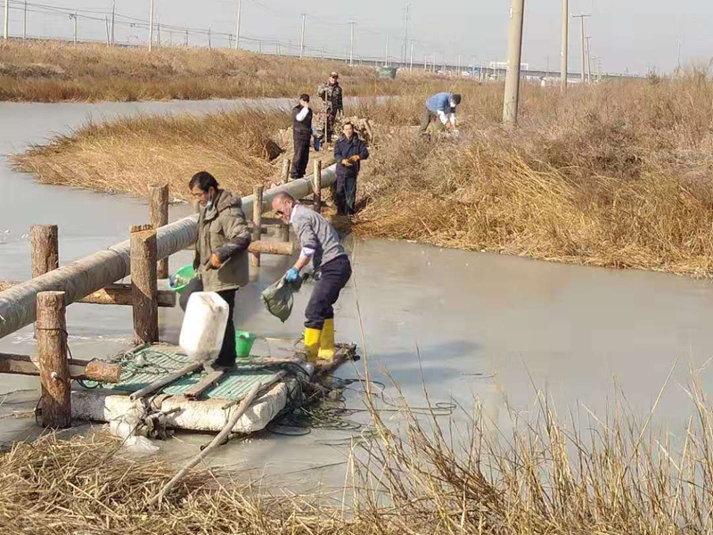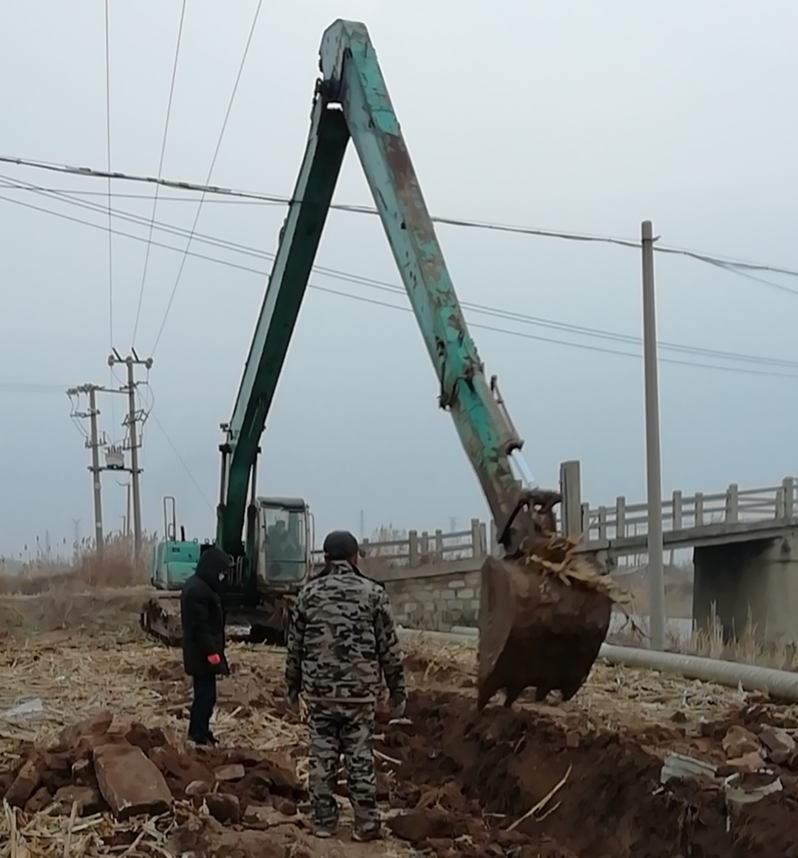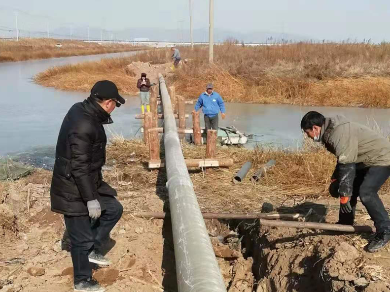 難!難!難!有困難才具有挑戰(zhàn),在“四拼”前一切困難皆為“紙老虎”,大家及時將壓力變?yōu)閯恿Α4_定方案后,立即分頭行動,一切工作按部就班,購買8米木樁,河岸邊專人指揮長臂挖掘機(jī)機(jī)械打樁,頭頂高壓線與通信線路相互交織,現(xiàn)場安全員全過程監(jiān)督指揮保障施工安全距離緊張施工,利用簡易泡沫筏人工敲開河面冰層,劃到河心鉆孔安裝木橫擔(dān),人工開挖河對岸管道,切割吊取管道,打磨涂覆,一切都在有條不紊的進(jìn)行中??紤]到玻璃鋼管道的易碎性,不敢使用挖掘機(jī)吊裝,只能全人工小心翼翼的一小段一小段的輕抬慢放,慢慢挪到門型橫擔(dān)上緩緩過河,捆綁固定,最后是對口纏裹涂覆回填竣工。