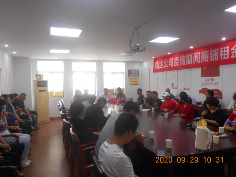 臨達公司黨支部堅決和黨中央保持一致,堅決擁護黨中央的決定,認(rèn)真學(xué)習(xí)了省、市以及集團公司等減免疫情期間房租的相關(guān)文件精神,仔細(xì)研究、反復(fù)討論,經(jīng)上報臺北投資公司、集團公司兩級黨委批準(zhǔn),9月29日下午,減免光伸建材市場、德蘭建材市場、金三角市場、原公司院內(nèi)倉庫、院外大棚、猴嘴山洞共48家商戶3個月租金,計52萬余元,減免金額達全年租金收入四分之一。