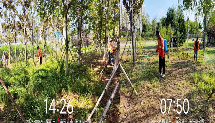 ? ? ? ?工作中,技術(shù)人員李傳武與管養(yǎng)班組長(zhǎng)班長(zhǎng)田恒亮、協(xié)管員葛承東奮戰(zhàn)在第一線,身先士卒,無(wú)懼高溫及蚊蟲叮咬,班組成員在其感染下,步調(diào)一致、步步為營(yíng),有序推進(jìn)各項(xiàng)工程進(jìn)度。經(jīng)統(tǒng)計(jì),在張圩港河公園100萬(wàn)平方米草坪綠化帶上開展各類修剪10次、雜草反復(fù)清理近20次、病蟲害藥物消殺4次、新栽各類苗木600余株、清理枯死樹木300余株、對(duì)相關(guān)造型樹進(jìn)行修型。在防汛抗旱維綠工作,采取白天人工澆水搭配晚間滴灌澆水的方法,確保綠綠植健康生長(zhǎng);暴雨后扶正傾倒樹木11余株,積極排澇2次……各項(xiàng)工作數(shù)據(jù)一路“飄紅”。
